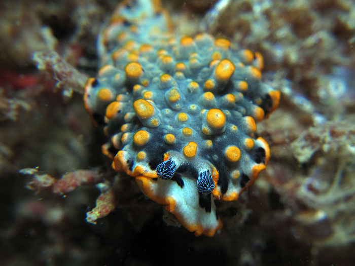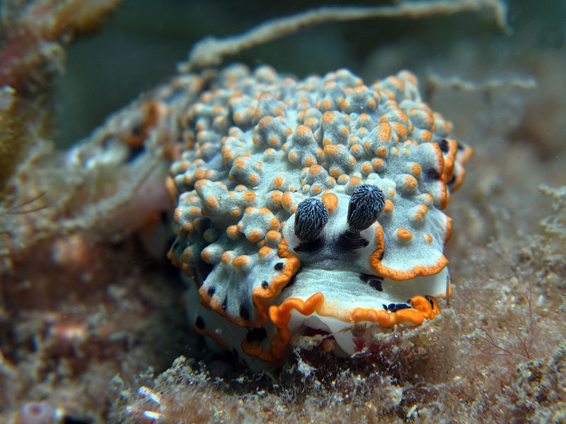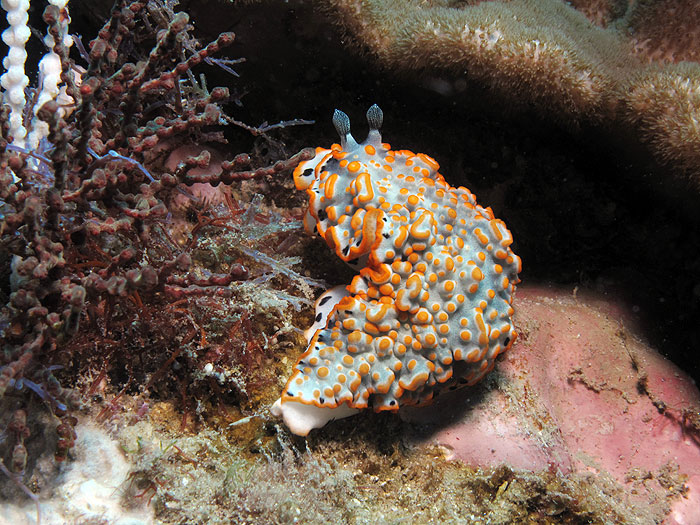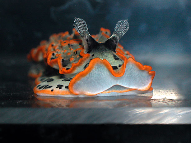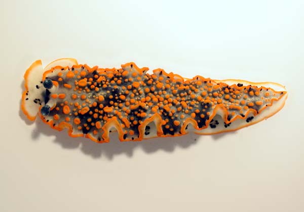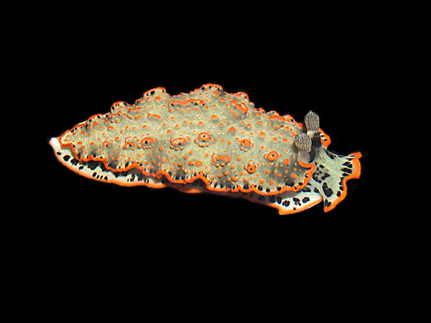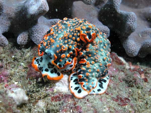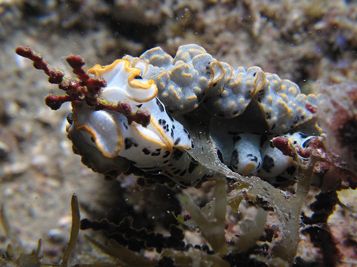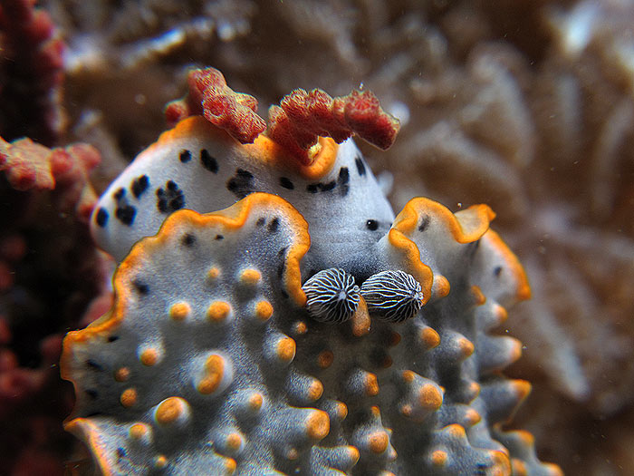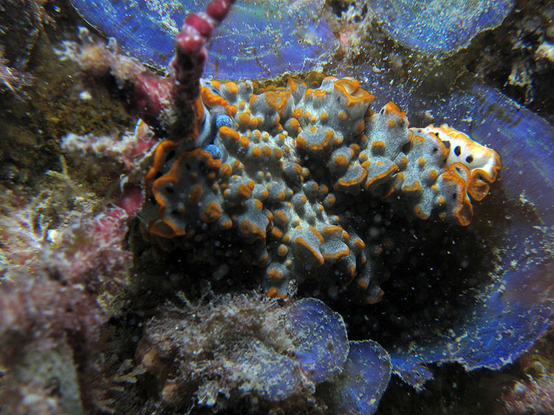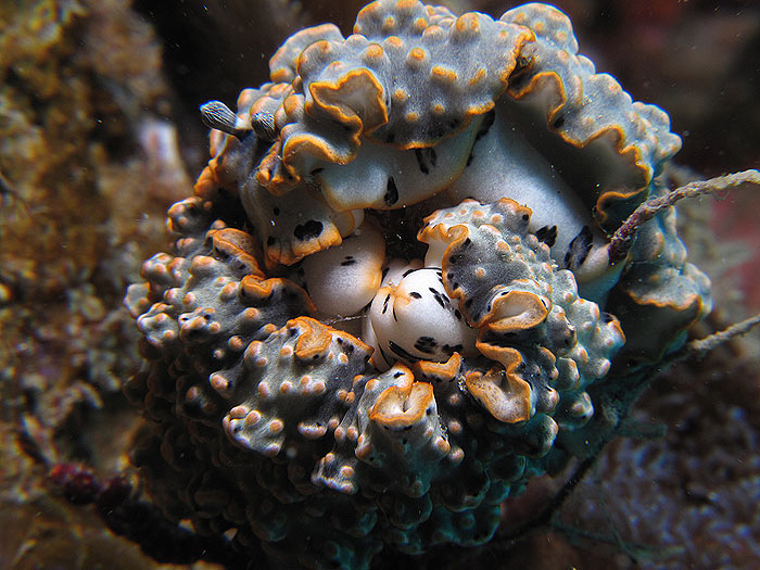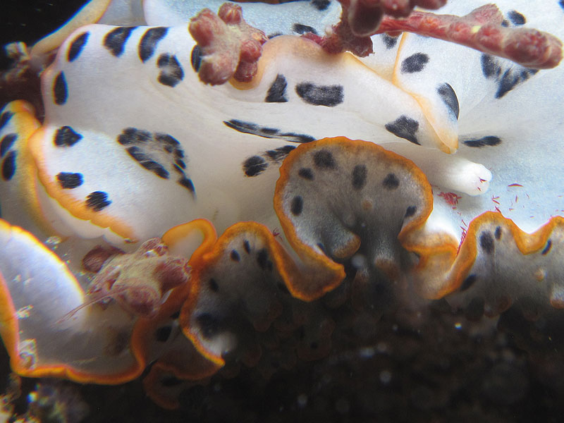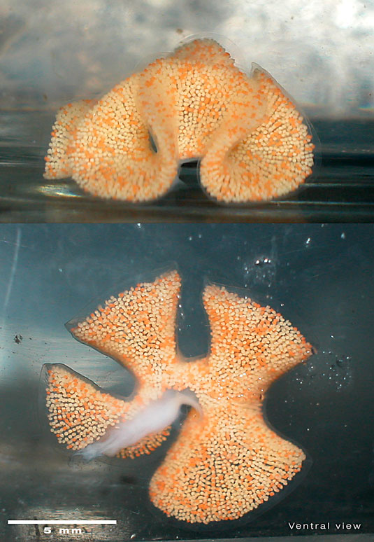 Below: Anus located on side of body between mantle and foot, expelling red spicules.