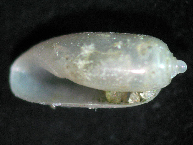 NOTE: Tornatina sp. 1 (family Cylichnidae), immature individuals. These photos, especially the second photo below, clearly show the heterostrophic protoconch (that is one in which coiling of the protoconch goes in an opposite direction to the adult shell a feature common to all the Heterogastropoda, which includes heterobranchs and pyramidellids) and also note the large and widely separated posterior lobes of the head shield. The thin blue margin on these lobes and also on the margin of the foot probably comes from a zone of especially long sensory hairs (cilia), not pigment. Interestingly for a bubble snail, the foot is short and lacks parapodia, and the Hancock’s organs are cuticularised. |