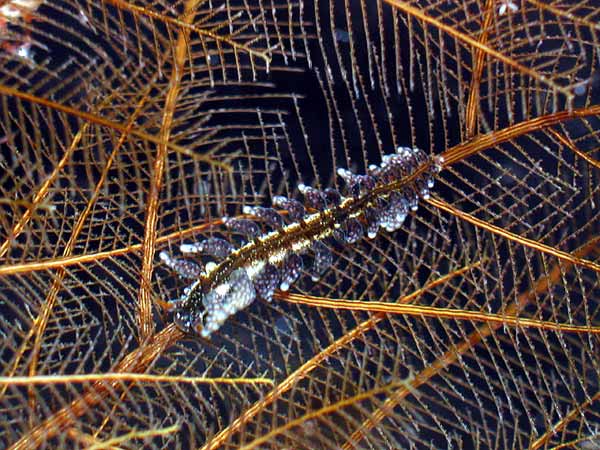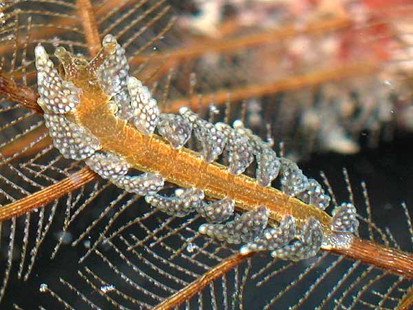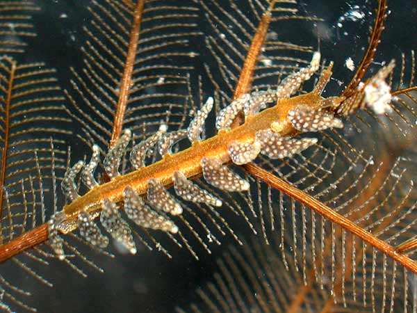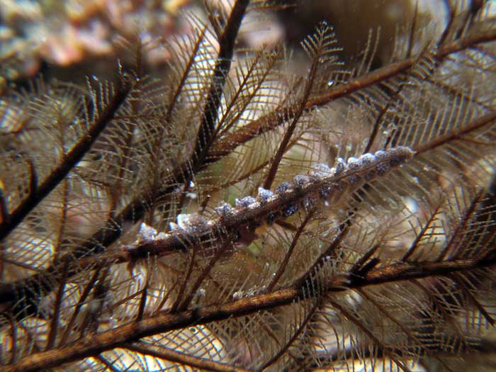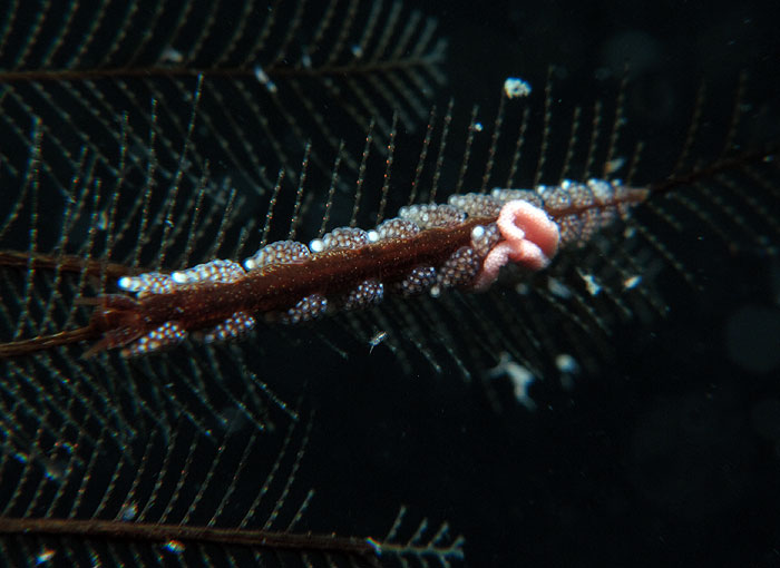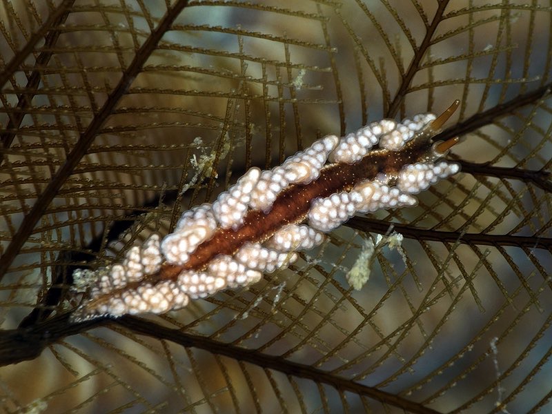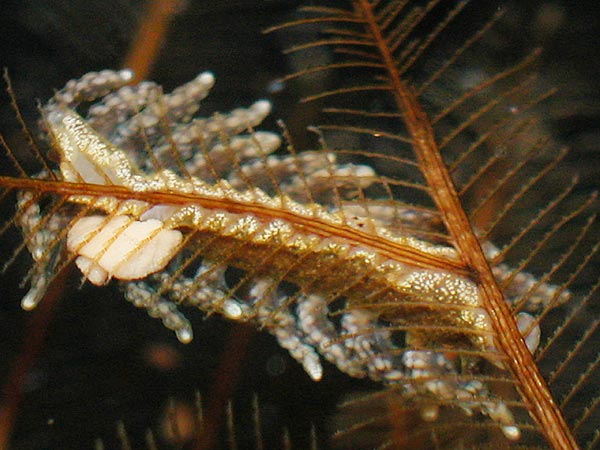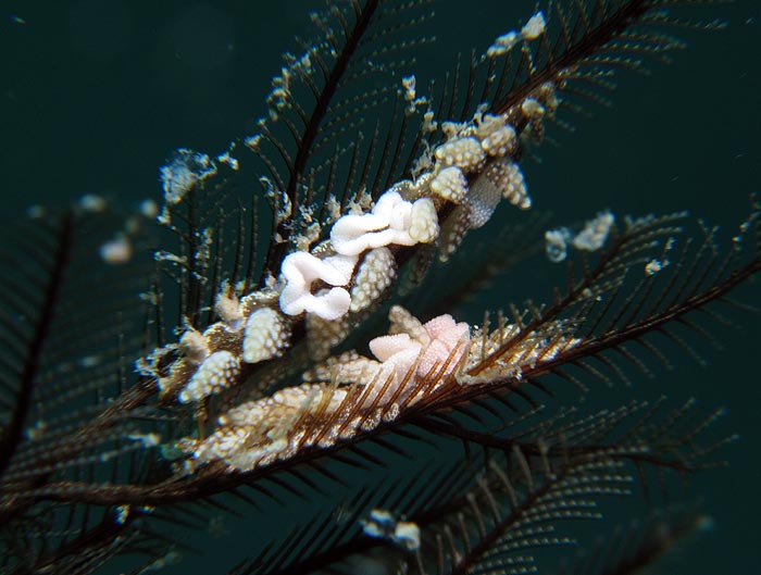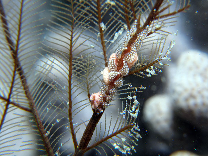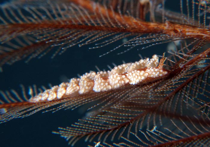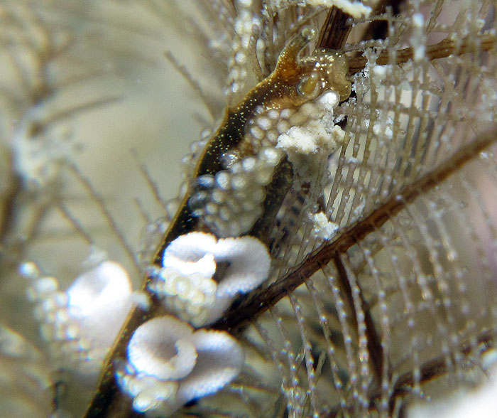 This species of Kabeiro, found at Shellacey Reef, lays its egg mass on its hydroid food, and the masses are not wound round the main axis of the hydroid in a spiral as they would be in aeolids. It’s also interesting that the adult remains in contact with the eggs while they are developing.