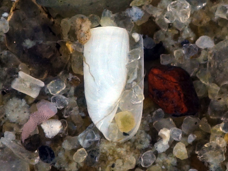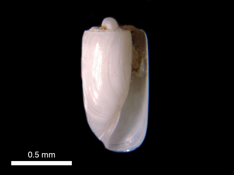 Below: The shell in-situ with a grain of sand covering the protoconch.