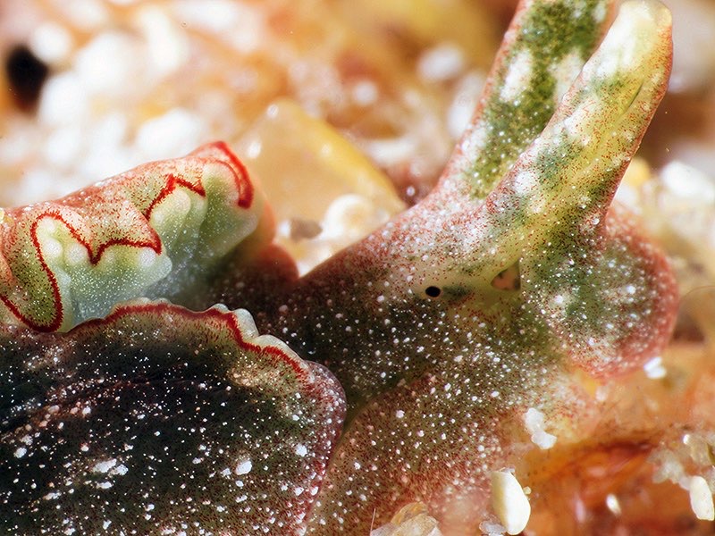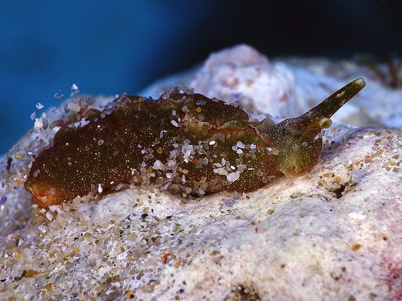 These two Elysia's were found tucked into an old half buried stag-head coral