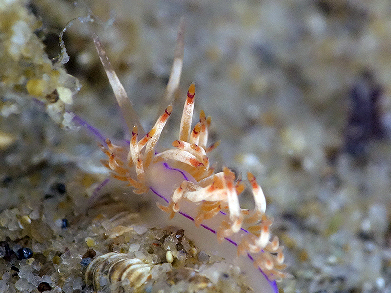 NOTE: The colouration of the cerata in this animal look like non we have seen. There appears to be a thin red band in the yellow tip.
