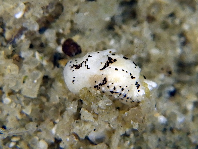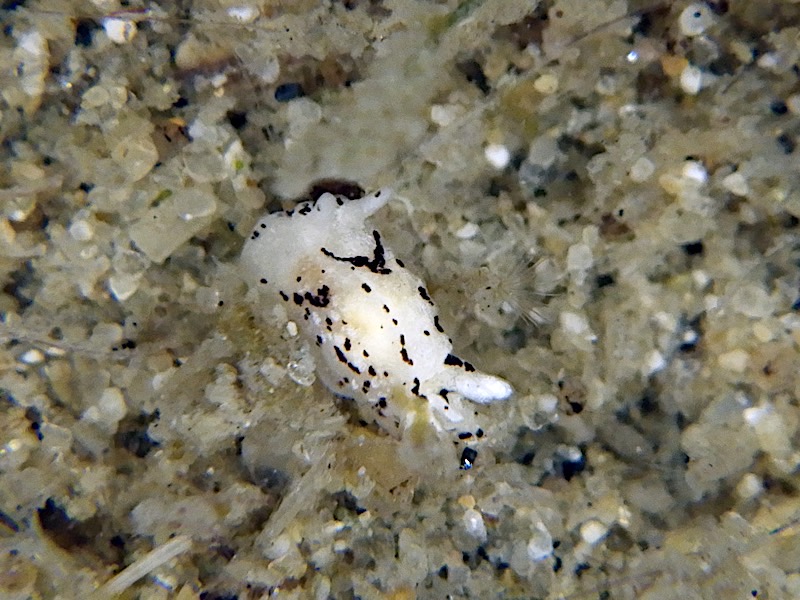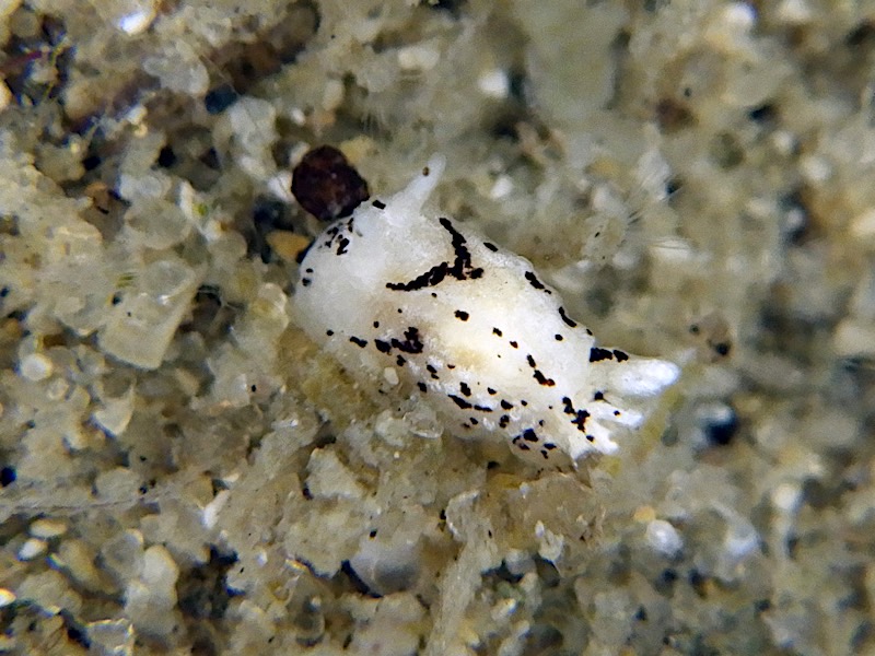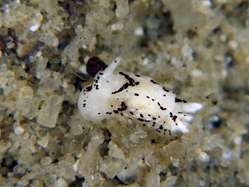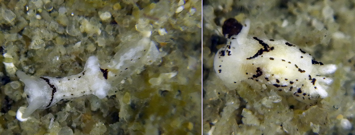 This species (right) has similar marking to Murphydoris puncticulata (left) but has no papillae and the has gills as seen in Goniodoridella species.