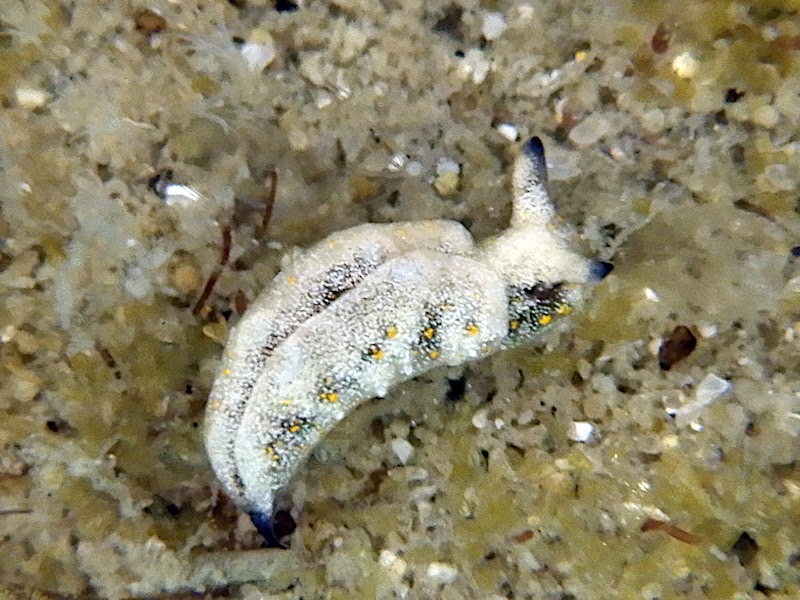 Similar to Elysia sp. 17 but with opaque white specs that cover the entire body.